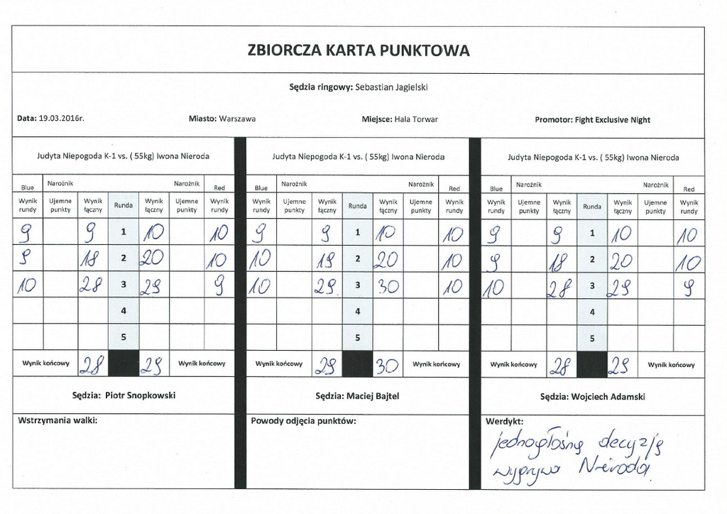 Sześć walk gali FEN 11 Warsaw Time zakończyło się werdyktami sędziowskimi. Jak w tych pojedynkach punktowali sędziowie sobotnich zawodów na Torwarze? Oto karty sędziowskie.