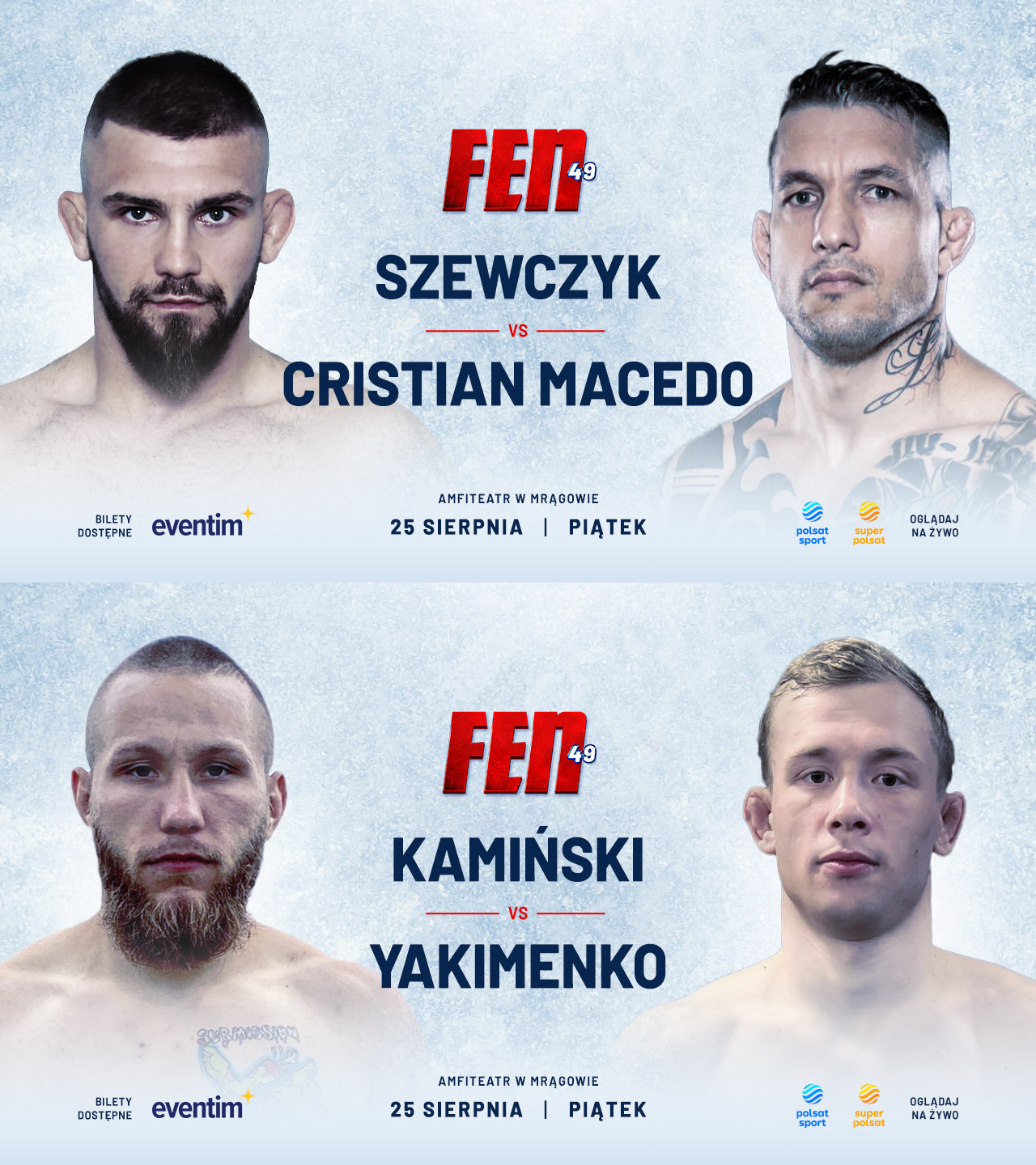 Piotr Kamiński (6-4, 2 KO, 3 SUB) podejmie Vitaliya Yakimenko (5-1, 1 KO, 2 SUB), a Bartosz Szewczyk (5-2-1, 3 KO, 1 SUB) Edersona Macedo (11-7, 2 KO, 9 SUB) podczas gali FEN 49, która 25 sierpnia odbędzie się w Mrągowie. Łukasz Klinger oraz Adrian Błoński nie wystąpią na Mazurach z powodu kontuzji.
