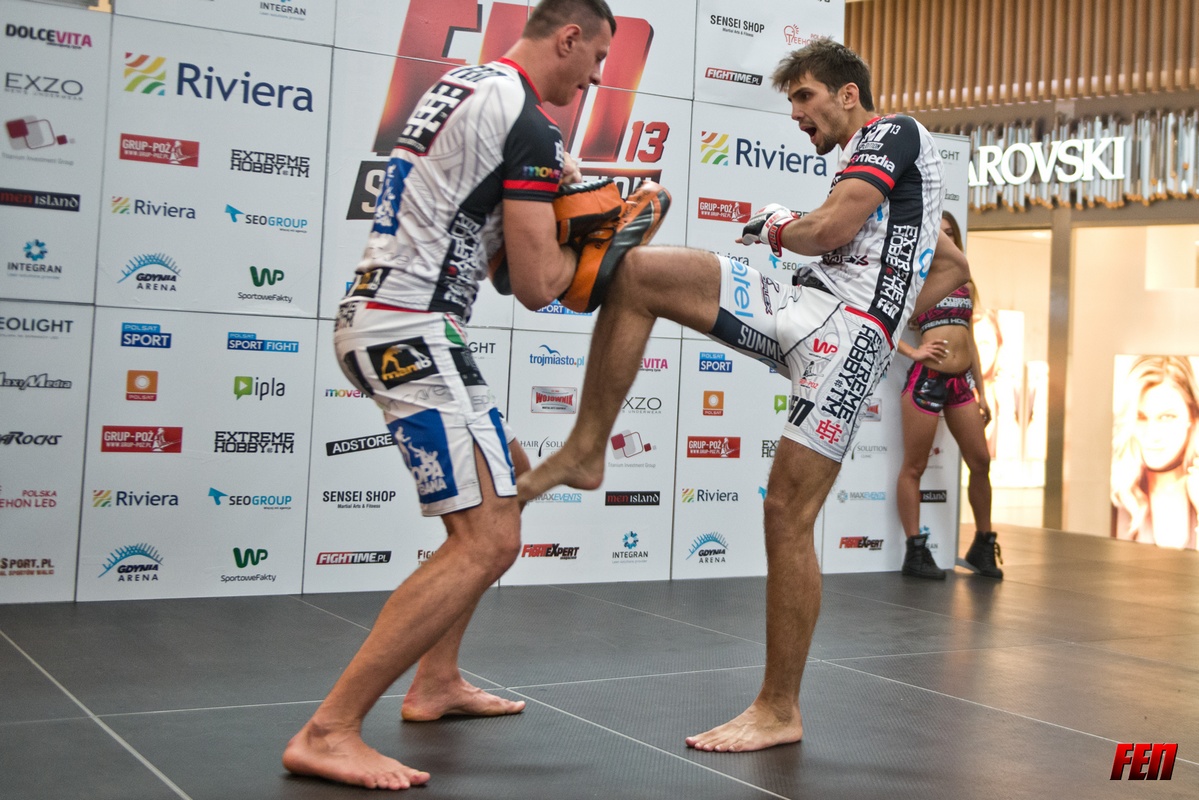 Fani zobaczyli także sporo efektownych ciosów i kopnięć w wykonaniu Jacka Krefta i Mariana Ziółkowskiego, dwóch młodych, bardzo utalentowanych fighterów MMA, którzy na gali FEN 13 będą ze sobą walczyć już po raz trzeci, oraz kickboksera Artura Bizewskiego, który będzie bić się z nieobecnym na media treningu Marcinem Szrederem. Z największym zainteresowaniem kibice i dziennikarze obserwowali jednak Piotra Hallmanna i Kamila Łebkowskiego, czołowych polskich zawodników MMA kategorii piórkowej, którzy zmierzą się ze sobą w walce wieczoru gali FEN 13 Summer Edition.